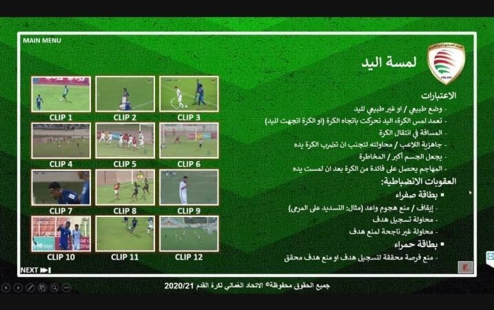 نظمت دائرة الحكام بالاتحاد العماني لكرة القدم باشراف من لجنة الحكام يومي الجمعة والسبت 25 و26 سبتمبر الجاري حلقتي عمل للحكام والمقيمين عن طريق الاتصال المرئي عن بعد، الحلقة الأولى أقيمت لحكام المستوى الثاني أ & ب بمشاركة 70 حكما، والحلقة الثانية خصصت لمقيمي الحكام وحكام المستوئ الاول بمشاركة 33 مقيما و 40 حكما من الحكام الدوليين والدرجة الاولئ، وحكام من مصر ولبنان، وتركزت حول مخالفة لمسة يد. أعد المادة التعليمية خبير الحكام بالاتحاد عمر بشتاوي، وأشرف عليها سالم البطاشي مدير دائرة الحكام بالاتحاد.