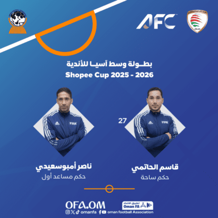 اختار الاتحاد الآسيوي لكرة القدم الحكمين الدوليين قاسم الحاتمي وناصر أمبوسعيدي لإدارة إحدى مباريات بطولة وسط آسيا للأندية (كأس شوبي)، وذلك تأكيدًا على الثقة المتواصلة التي يحظى بها التحكيم العُماني، وحضوره المميز في مختلف الاستحقاقات القارية والدولية.